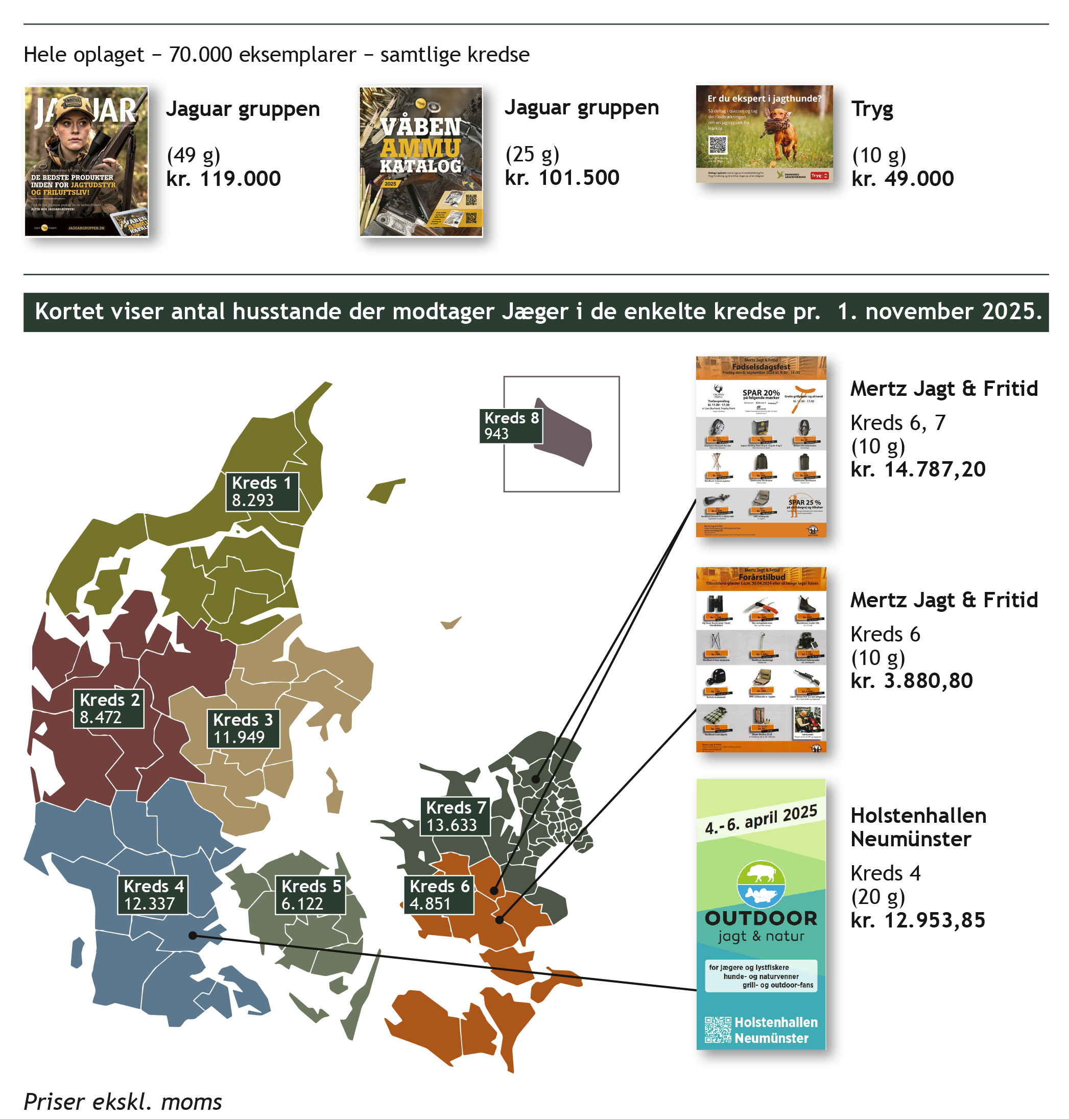 Vælg hele oplaget, eller få det segmenteret geografisk ud fra din målgruppe. Da magasinet Jæger udsendes folieret, er et indstik en unik mulighed for at komme i direkte kontakt med potentielle kunder og forlænge levetiden af dine budskaber.