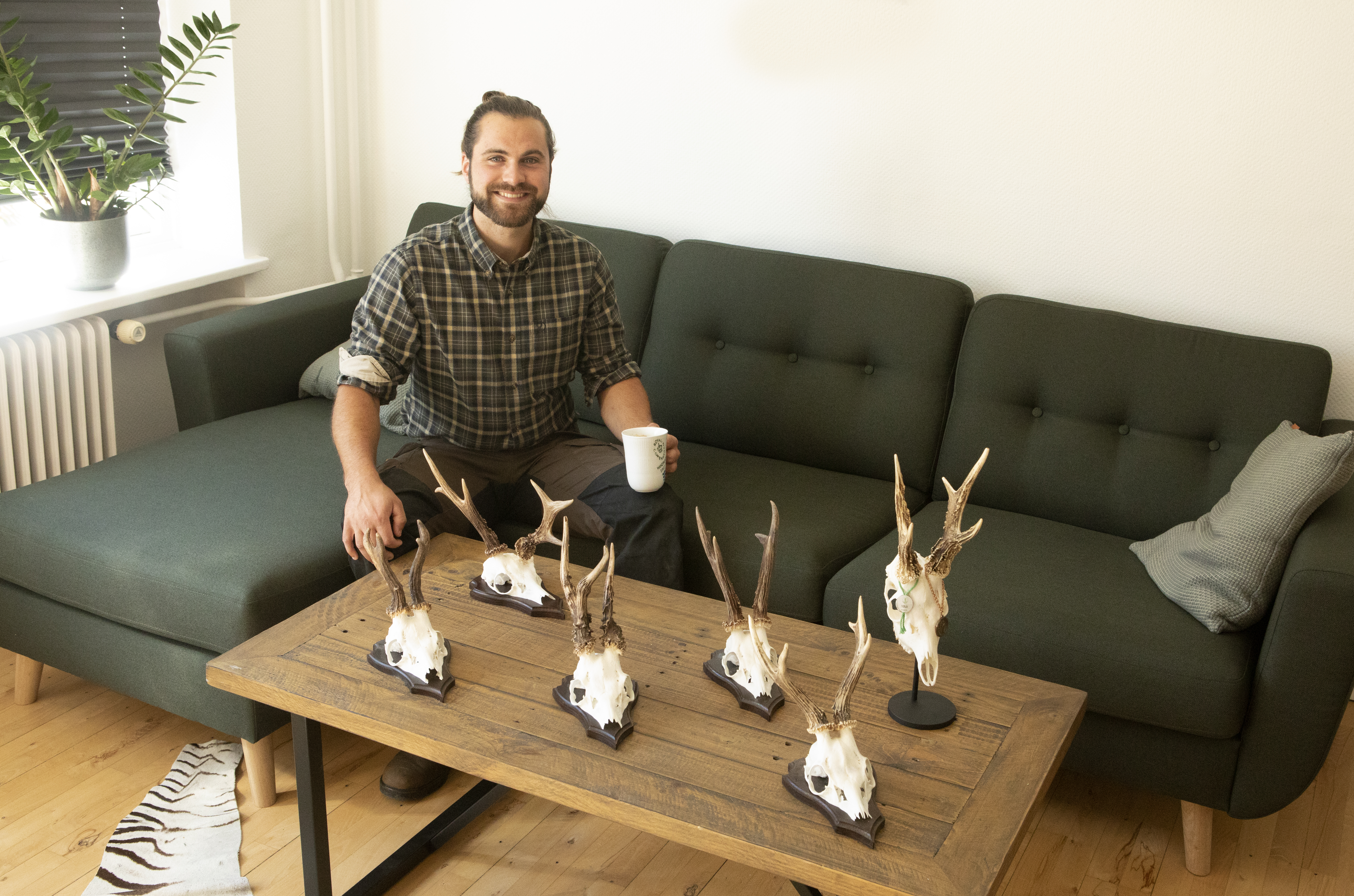 Lasse med de mange forskellige bukkeopsatser han fik med hjem fra sin første polske tur efter bukke i brunsten.