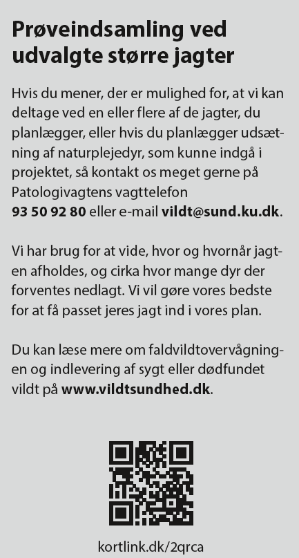 Forskerne ønsker igen i år at komme i kontakt med personer, der planlægger jagter, hvor der forventes ti eller flere nedlagte dyr (kronvildt, dåvildt, sikavildt, råvildt, muflon), og hvor det er muligt at udføre prøveudtagning. Vi udtager blodprøver fra de nedlagte dyr og gerne også milten fra samme dyr.
