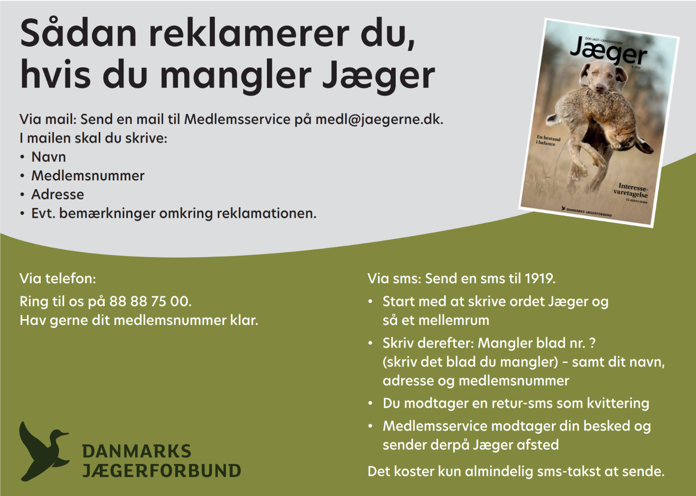 Jæger er et populært medlemsmagasin, som vi ved betyder meget for mange af DJ’s medlemmer. Derfor er det vigtigt for os, at du modtager dit Jæger til tiden. Hvis du ikke har fået dit magasin senest på den dato, der er angivet som sidste distributionsdag i den pågældende udgave, vil vi bede dig lave en reklamation.