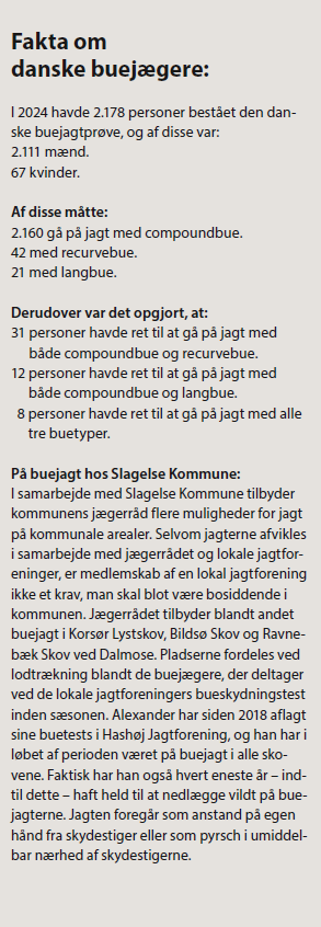 Da jagten er forbi, aftaler vi, at Alexander kan kontakte mig, hvis han nedlægger et dyr, så jeg kan høre lidt om jagten. Efter sæsonen fortæller han, at han havde flere lige-ved-og-næsten-chancer de sidste dage af januar, og at han havde trukket et par gange på de jagter. Det rigtige dyr var dog ikke kommet for på den rigtige måde og på det rigtige sted. For første gang, siden han begyndte at deltage på buejagter med Slagelse Jægerråd, er det ikke lykkedes ham at nedlægge et dyr i den skovpart, han har udtrukket – men sådan er buejagt altså også nogle gange.