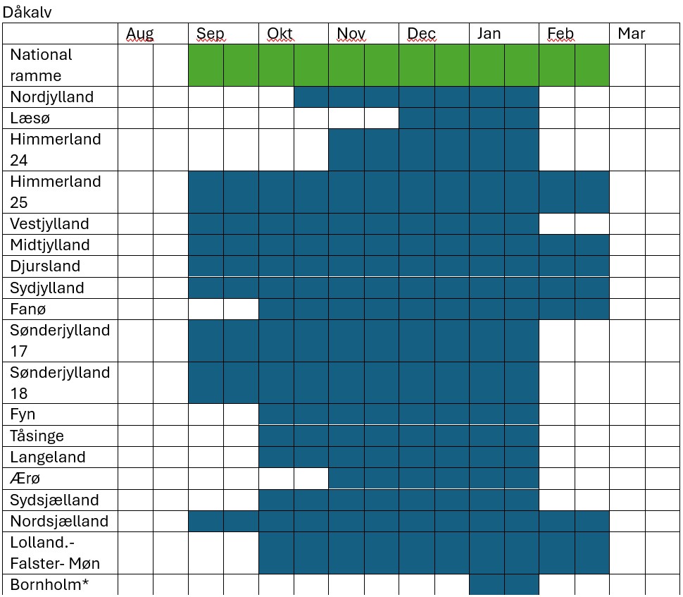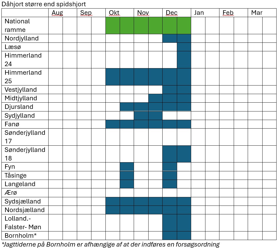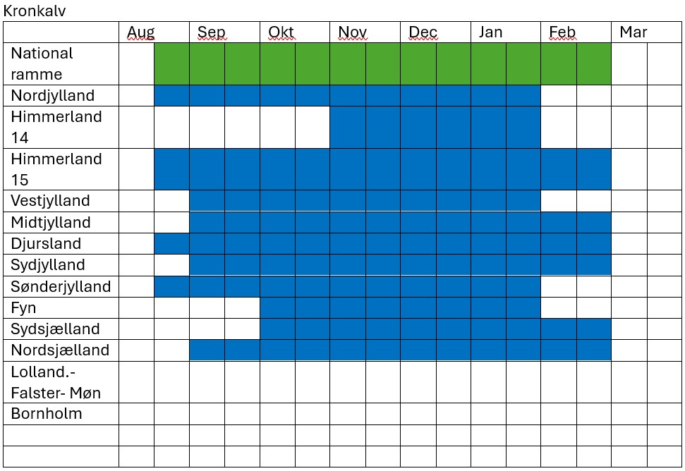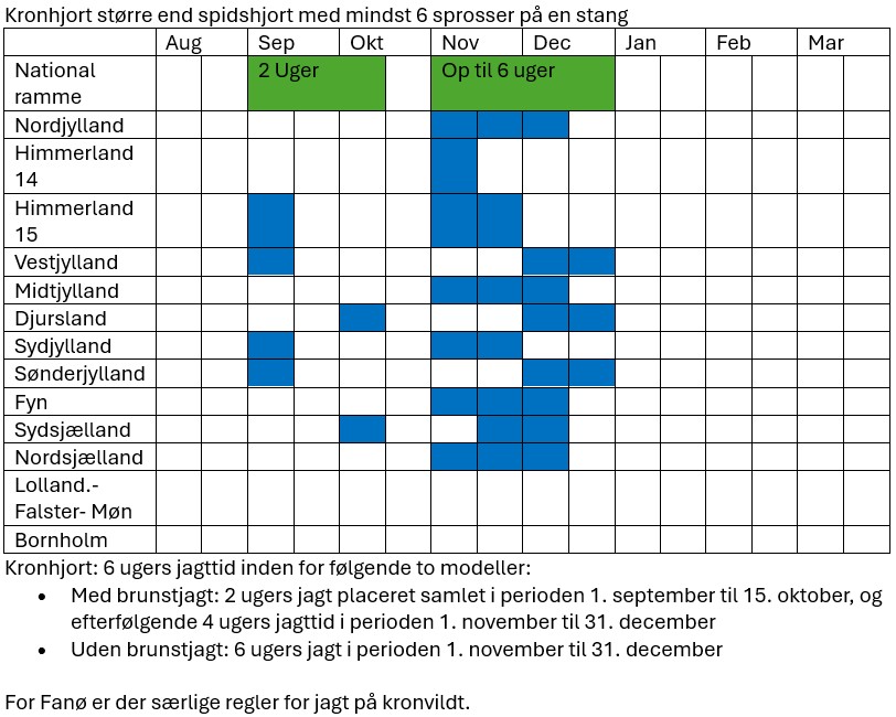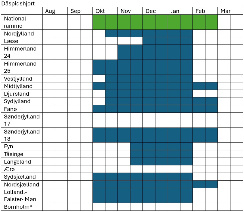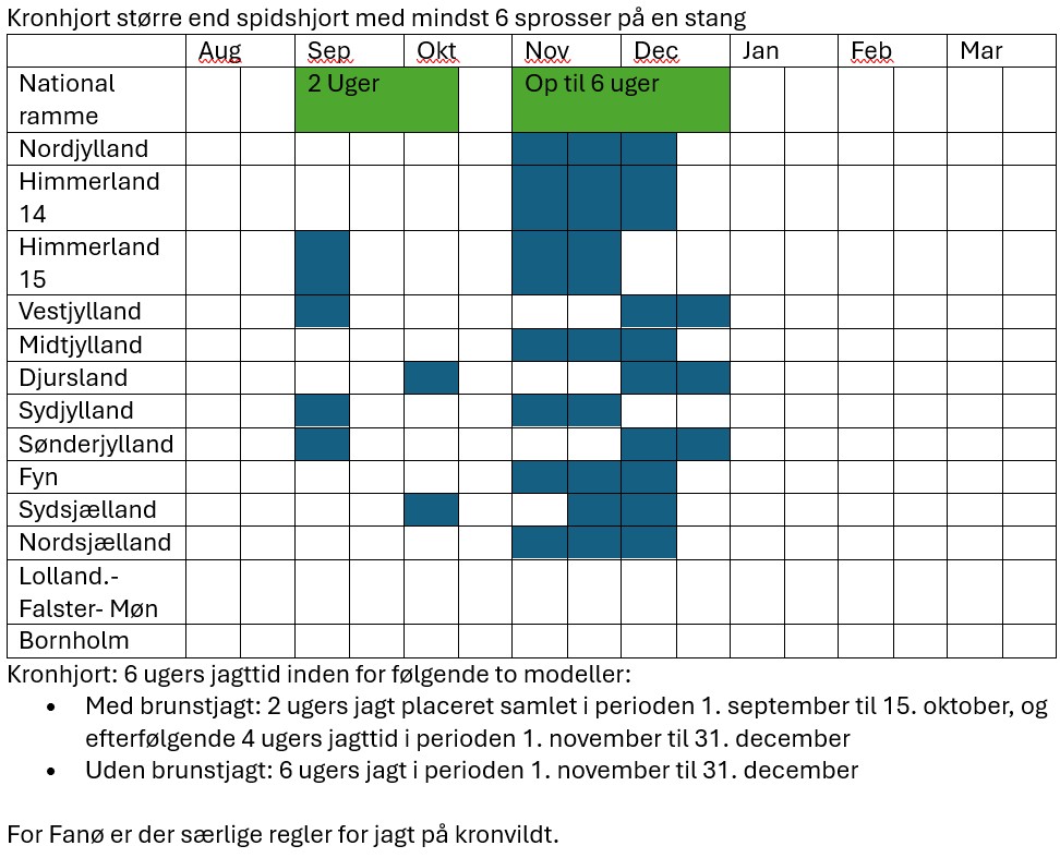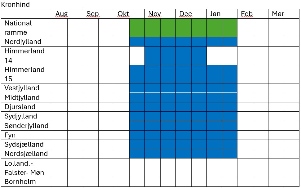 Den Nationale Hjortevildtgruppe har udarbejdet en overordnet jagttidsramme for dåvildt og kronvildt. På den baggrund har de 12 regionale hjortevildtregioner indsendt deres indstillinger. Disse er efterfølgende blevet behandlet af Den Nationale Hjortevildtgruppe og senest af Vildtforvaltningsrådet.