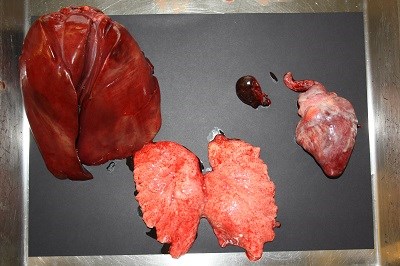 Fugl: Lever (stor, tv.), lunge (lys i midten), milt (lille) og hjerte (th.)